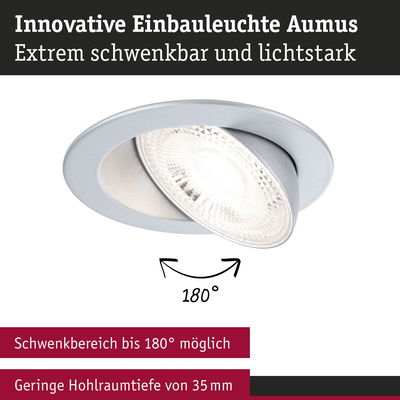Die Einbauleuchte Aumus in Chrom matt setzt mit ihrer Schwenkbarkeit von bis zu 180° und einer minimalen Hohlraumtiefe von nur 35 mm neue Standards in der Beleuchtungstechnik. Vor der Installation kann aus drei Optionen (2700 K, 4000 K oder 6500 K) per Dip-Schalter die individuelle Lichtfarbe ausgewählt werden, dank der White-Select-Funktion. Zudem bietet die Einbauleuchte eine praktische 3-Step-Dimm-Funktion, mit der das Dimmlevel in drei Stufen (100%, 50%, 25%) mit einem herkömmlichen Wandschalter angepasst werden kann. Dank der innovativen Anschlussbox lässt sich die Einbauleuchte ohne Werkzeug innerhalb von wenigen Sekunden montieren. Mit ihrem ansprechenden Design und innovativer Technologie ist die Einbauleuchte die optimale Wahl für jeden Raum, in dem eine flexible und effektive Beleuchtungslösung gefragt ist.