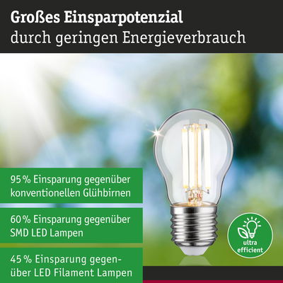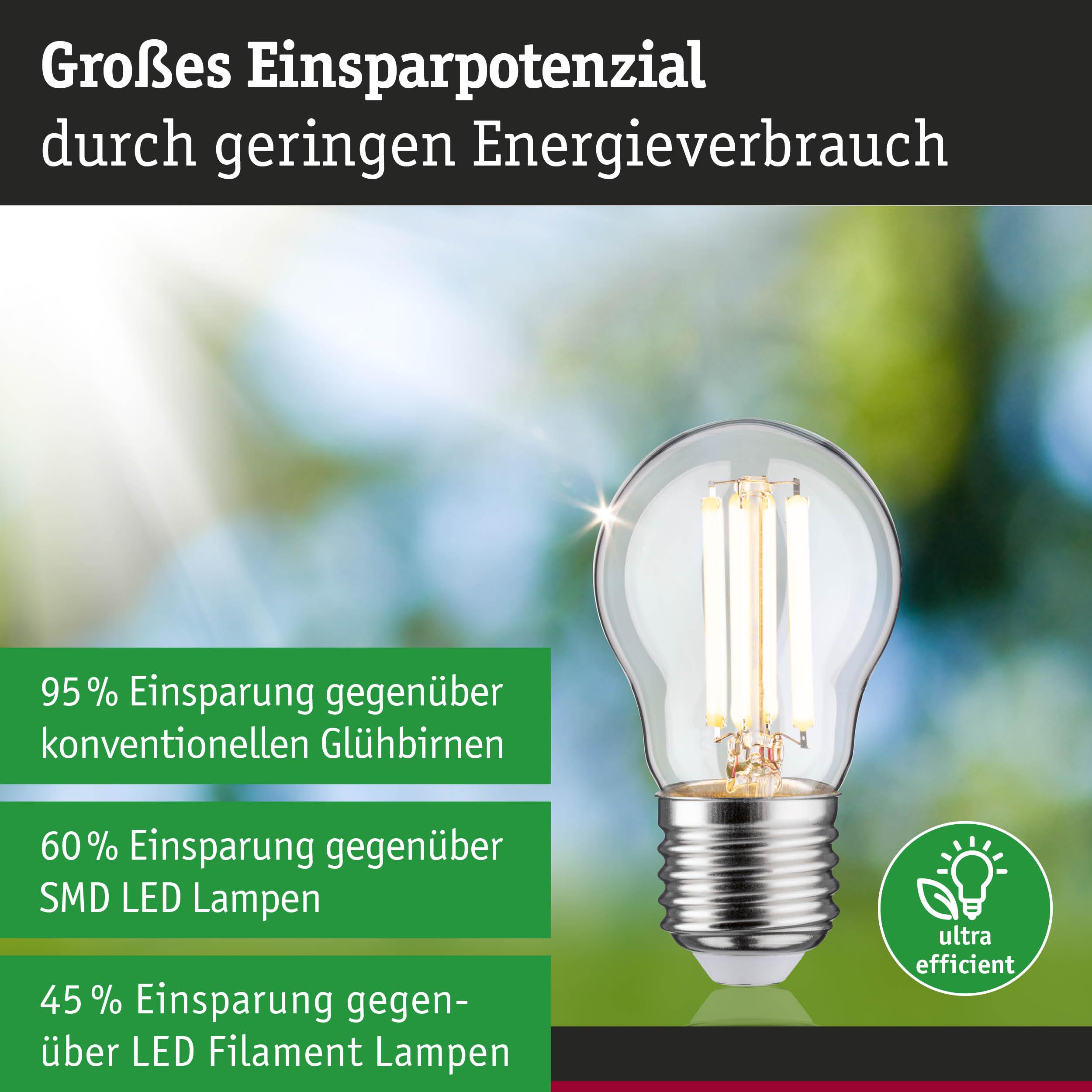 Die ultra-effizienten LED-Leuchtmittel der Eco-Line verbinden innovative Technik mit Nachhaltigkeit und sorgen für eine effiziente und stilvolle Beleuchtung. Dank des 60 % niedrigeren Energieverbrauchs und der deutlich längeren Lebensdauer gegenüber Standard LED-Lampen, lassen sich die Energiekosten erheblich senken und ganz nebenbei noch die Umwelt schonen. Die klare Filament-Tropfenlampe passt in jede handelsübliche E27 Fassung und schafft mit 3000K, einer Leistung von 2,5W und 525lm ein angenehm warmweißes Licht ohne Grünstich. Dadurch verwandelt das tropfenförmige Leuchtmittel jeden Raum in ein harmonisches Wohlfühlambiente. Tropfenlampen eignen sich dank ihrer kompakten Bauform ideal für den Einsatz in kleinen Leuchten. Die Paulmann LED-Lampen mit Eye friendly-Siegel bieten augenschonendes und komfortables Licht. Ob beim Arbeiten, Lesen oder Entspannen, die Lampen tragen zu bestem Sehkomfort bei.