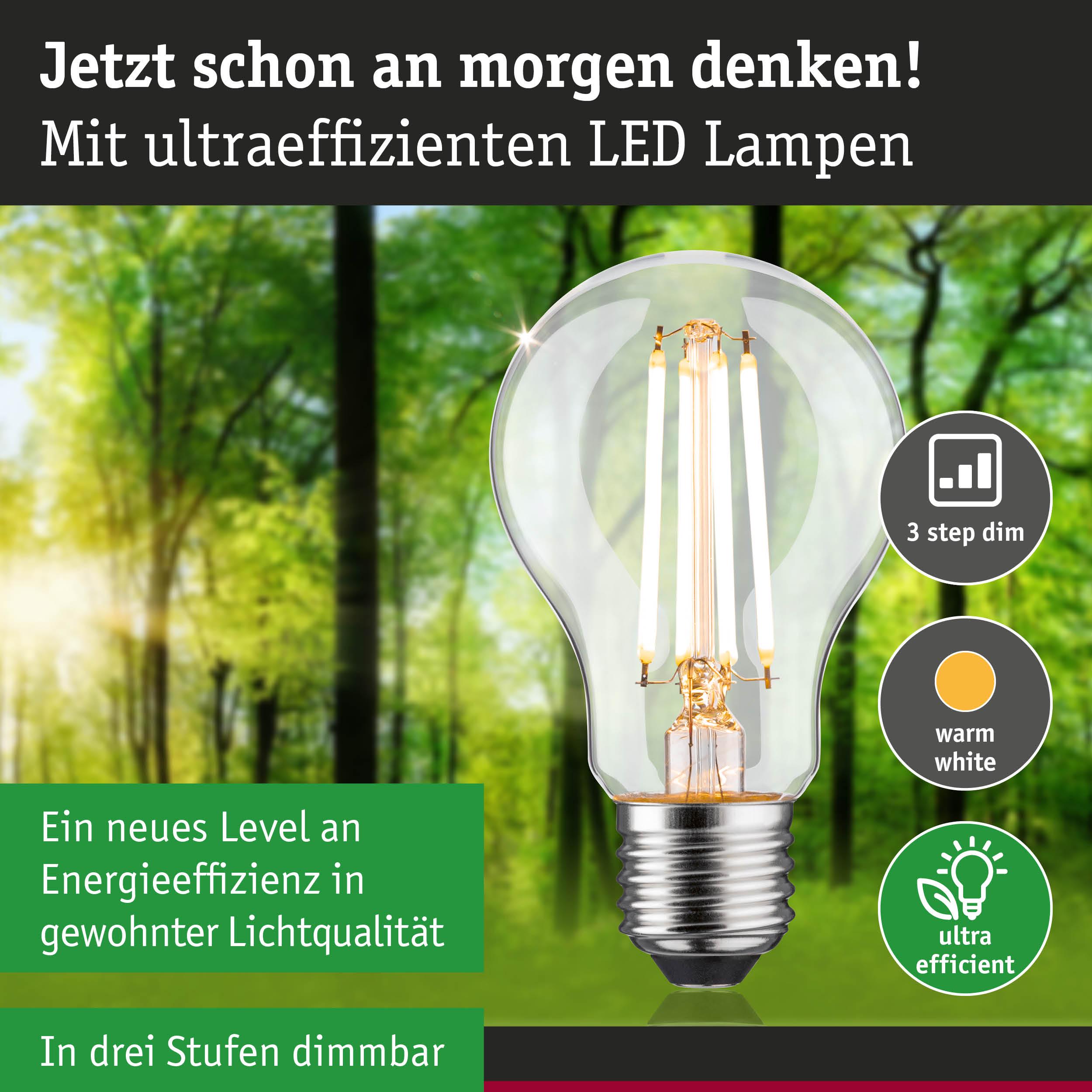 Die ultra-effizienten LED-Leuchtmittel der Eco-Line verbinden innovative Technik mit Nachhaltigkeit und sorgen für eine effiziente und stilvolle Beleuchtung. Dank des 60 % niedrigeren Energieverbrauchs und der deutlich längeren Lebensdauer gegenüber Standard LED-Lampen, lassen sich die Energiekosten erheblich senken und ganz nebenbei noch die Umwelt schonen. Die klare Filament LED Birne passt in jede handelsübliche E27 Fassung und schafft mit 3000K, einer Leistung von 2,5W und 470lm ein angenehm warmweißes Licht ohne Grünstich. Selbst große Lampenschirme werden gleichmäßig ausgeleuchtet, wodurch jeder Raum in ein harmonisches Wohlfühlambiente verwandelt wird. Je nach individuellem Bedarf lässt sich die Helligkeit des Leuchtmittels in 3 Stufen über einen handelsüblichen Lichtschalter dimmen. Der Dimmer verfügt über eine Memory Funktion. Die Paulmann LED-Lampen mit Eye friendly-Siegel bieten augenschonendes und komfortables Licht. Ob beim Arbeiten, Lesen oder Entspannen, die Lampen tragen zu bestem Sehkomfort bei.