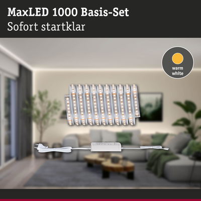 Das warmweiße MaxLED 1000 Basisset ist die ideale Wahl für eine moderne und besonders energieeffiziente Beleuchtungslösung. Im Vergleich zu herkömmlichen Leuchten benötigt der LED Strip 40 % weniger Energie, bei gleichem Lichtoutput. Der Strip eignet sich hervorragend für den Einsatz in Profilen und ist mit 22W und 1100lm/m so leistungsstark, dass er problemlos zur Raumausleuchtung eingesetzt werden kann. Die Farbtemperatur von 2700K sorgt für ein gemütliches und blendfreies Licht- ideal für die Beleuchtung in Wohnzimmern, Küchen oder Schlafzimmern. Um jederzeit die gewünschte Lichtstimmung zu kreieren, lässt sich die Helligkeit flexibel dimmen. Mit einer Schere kann der Strip ganz einfach gekürzt werden und erleichtert so die Anpassung an individuelle Raumbegebenheiten. Da der Strip problemlos an Möbel, Regale oder Wände angebracht werden kann, eröffnen sich vielfältige Gestaltungsoptionen. Das Basisset enthält neben dem Streifen ein passendes Vorschaltgerät. Es lässt sich nach Bedarf um eine Steuerungseinheit mit Fernbedienung erweitern.
