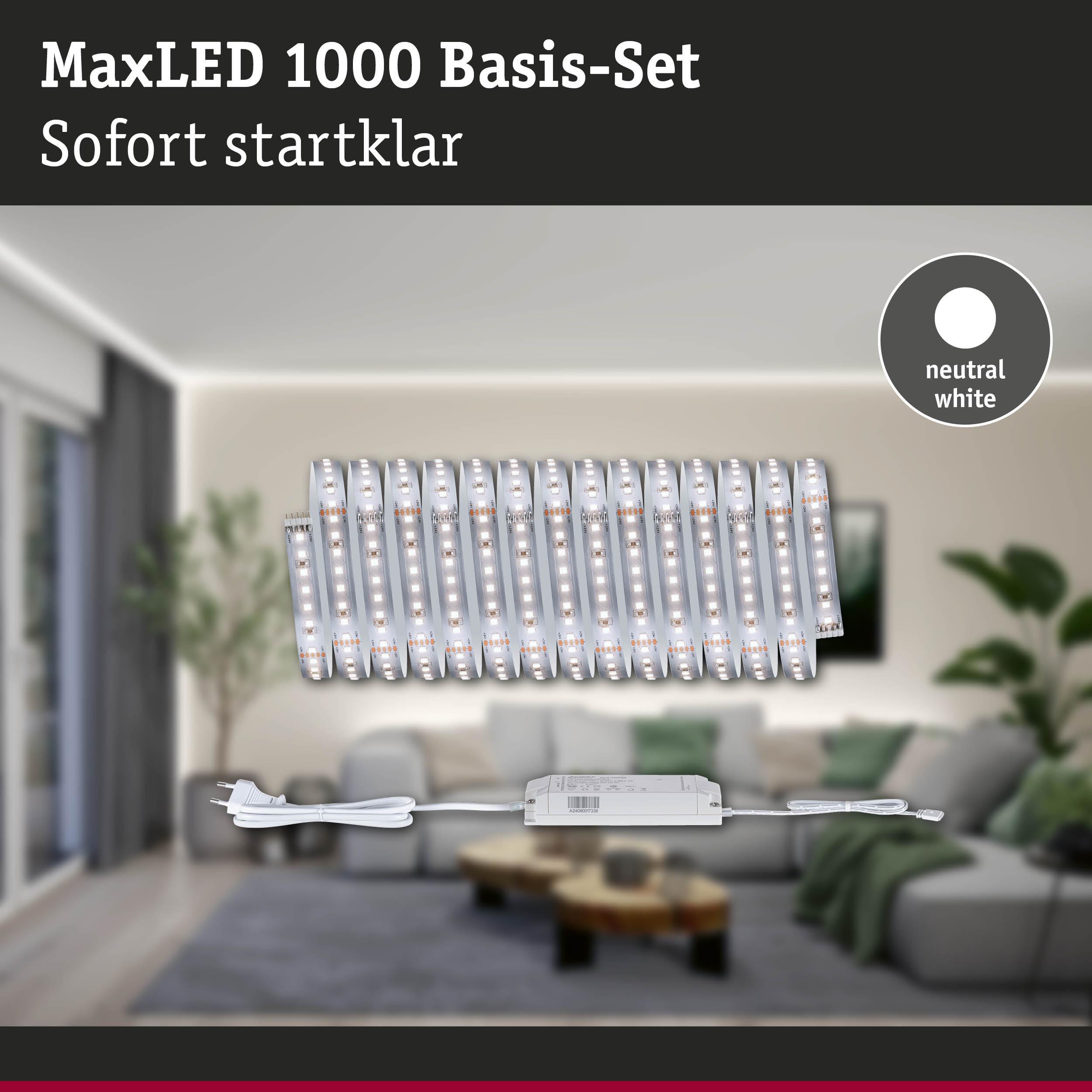 Das neutralweiße MaxLED 1000 Basisset ist die ideale Wahl für eine moderne und besonders energieeffiziente Beleuchtungslösung. Im Vergleich zu herkömmlichen Leuchten benötigt der LED Strip 40 % weniger Energie, bei gleichem Lichtoutput. Der Strip eignet sich hervorragend für den Einsatz in Profilen und ist mit 30 Watt und 1100lm/m so leistungsstark, dass er problemlos zur Raumausleuchtung eingesetzt werden kann. Die Farbtemperatur von 4000K sorgt für ein funktionales und blendfreies Licht- ideal für die Beleuchtung in Wohnzimmern, Küchen oder Schlafzimmern. Um jederzeit die gewünschte Lichtstimmung zu kreieren, lässt sich die Helligkeit flexibel dimmen. Mit einer Schere kann der Strip ganz einfach gekürzt werden und erleichtert so die Anpassung an individuelle Raumbegebenheiten. Da der Strip problemlos an Möbel, Regale oder Wände angebracht werden kann, eröffnen sich vielfältige Gestaltungsoptionen. Das Basisset enthält neben dem Streifen ein passendes Vorschaltgerät. Es lässt sich nach Bedarf um eine Steuerungseinheit mit Fernbedienung erweitern.