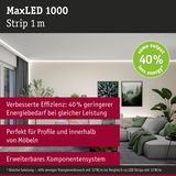 Der neutralweiße MaxLED 1000 LED Strip ist die ideale Wahl für eine moderne und besonders energieeffiziente Beleuchtungslösung. Im Vergleich zu herkömmlichen Leuchten benötigt der LED Strip 40 % weniger Energie, bei gleichem Lichtoutput. Der Strip eignet sich hervorragend für den Einsatz in Profilen und ist mit 8 Watt und 1100lm/m so leistungsstark, dass er problemlos zur Raumausleuchtung eingesetzt werden kann. Die Farbtemperatur von 4000K sorgt für ein funktionales und blendfreies Licht- ideal für die Beleuchtung in Wohnzimmern, Küchen oder Schlafzimmern. Um jederzeit die gewünschte Lichtstimmung zu kreieren, lässt sich die Helligkeit flexibel dimmen. Mit einer Schere kann der Strip ganz einfach gekürzt werden und erleichtert so die Anpassung an individuelle Raumbegebenheiten. Da der Strip problemlos an Möbel, Regale oder Wände angebracht werden kann, eröffnen sich vielfältige Gestaltungsoptionen.
