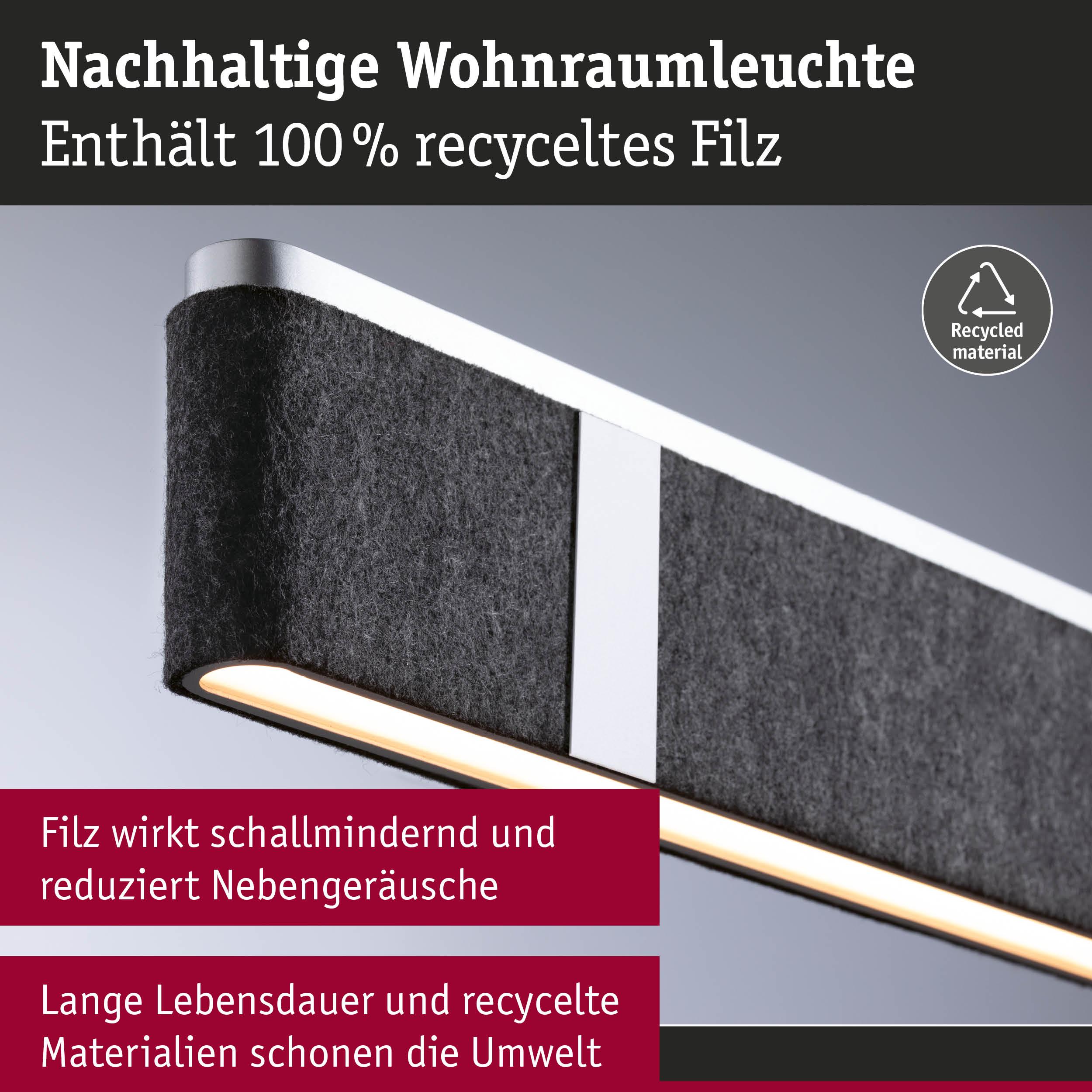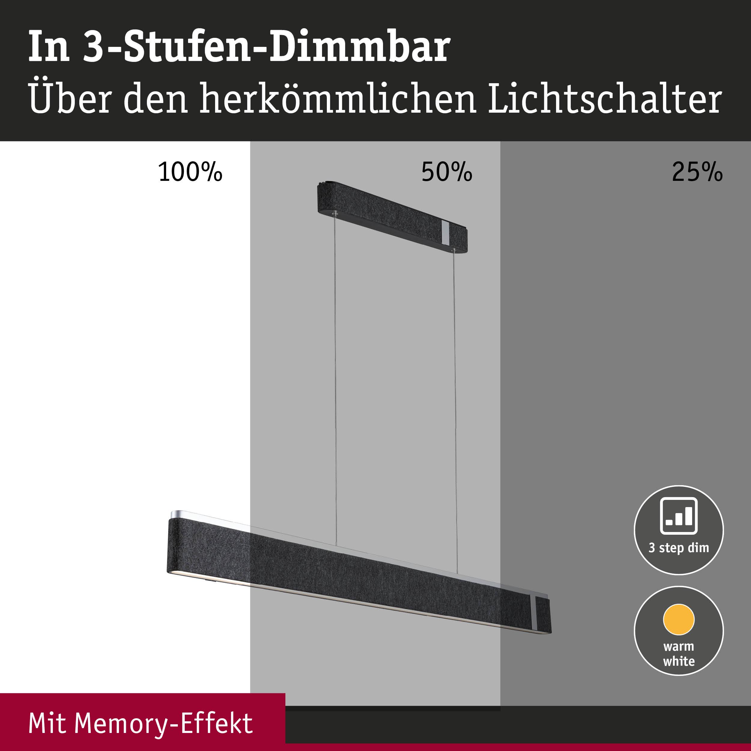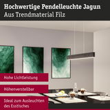 Die höhenverstellbare LED Pendelleuchte Jagun aus Filz in Anthrazit mit 2000lm beeindruckt nicht nur mit ihrem modernen und schlichten Design, sondern schafft auch eine angenehme Atmosphäre und reduziert störende Hintergrundgeräusche. Zusätzlich besteht sie aus nachhaltigem, wiederverwertetem Material. Dank der hohen Lichtleistung eignet sich die Pendelleuchte perfekt dafür, um Ess- oder Besprechungstische auszuleuchten. Die warme Farbtemperatur erzeugt ein gemütliches Ambiente für entspannte Stunden zu Hause. Mit einem handelsüblichen Wandschalter lässt sich die Leuchte in 3 Stufen dimmen. Dank der Memoryfunktion merkt sich die Leuchte immer die bevorzugten Einstellungen.