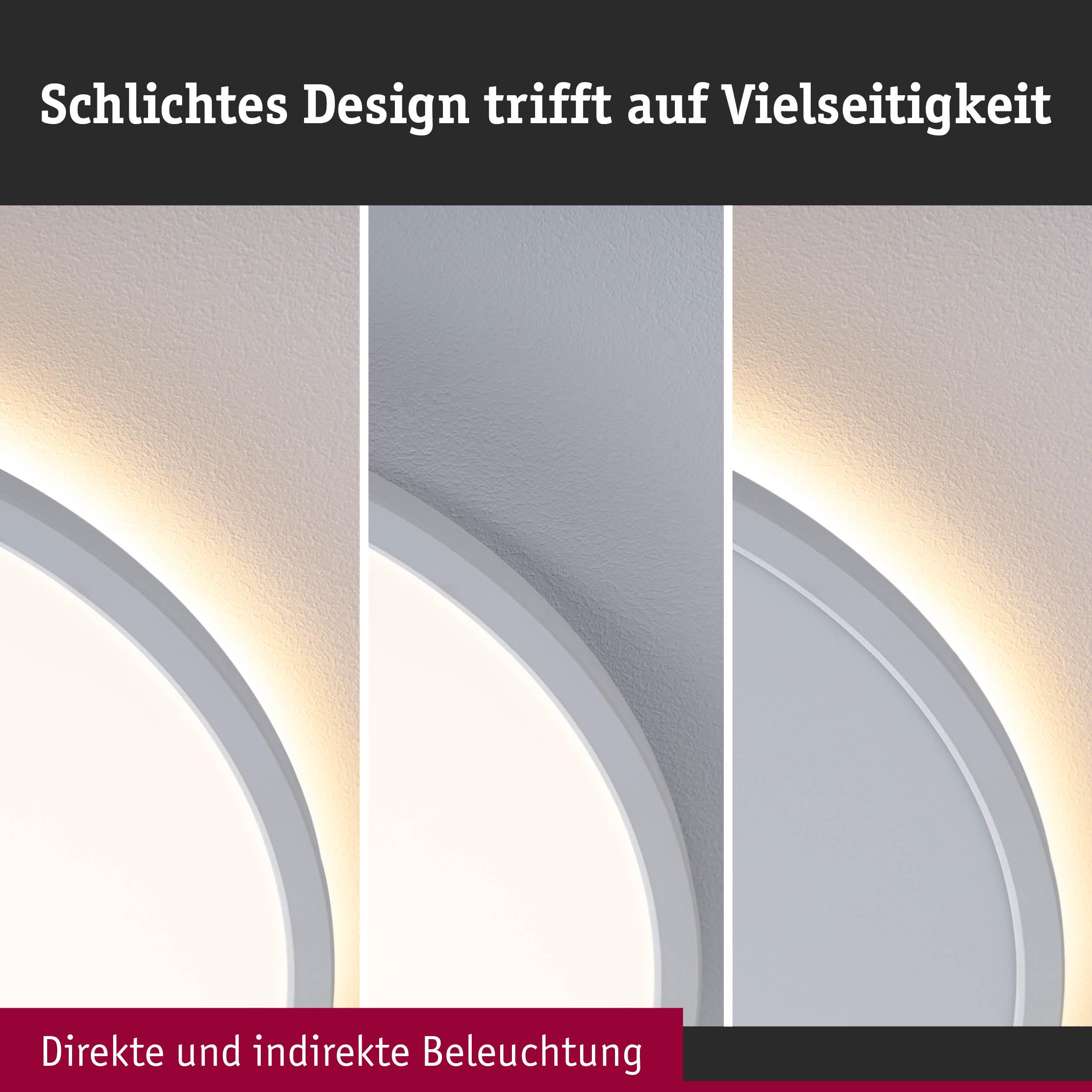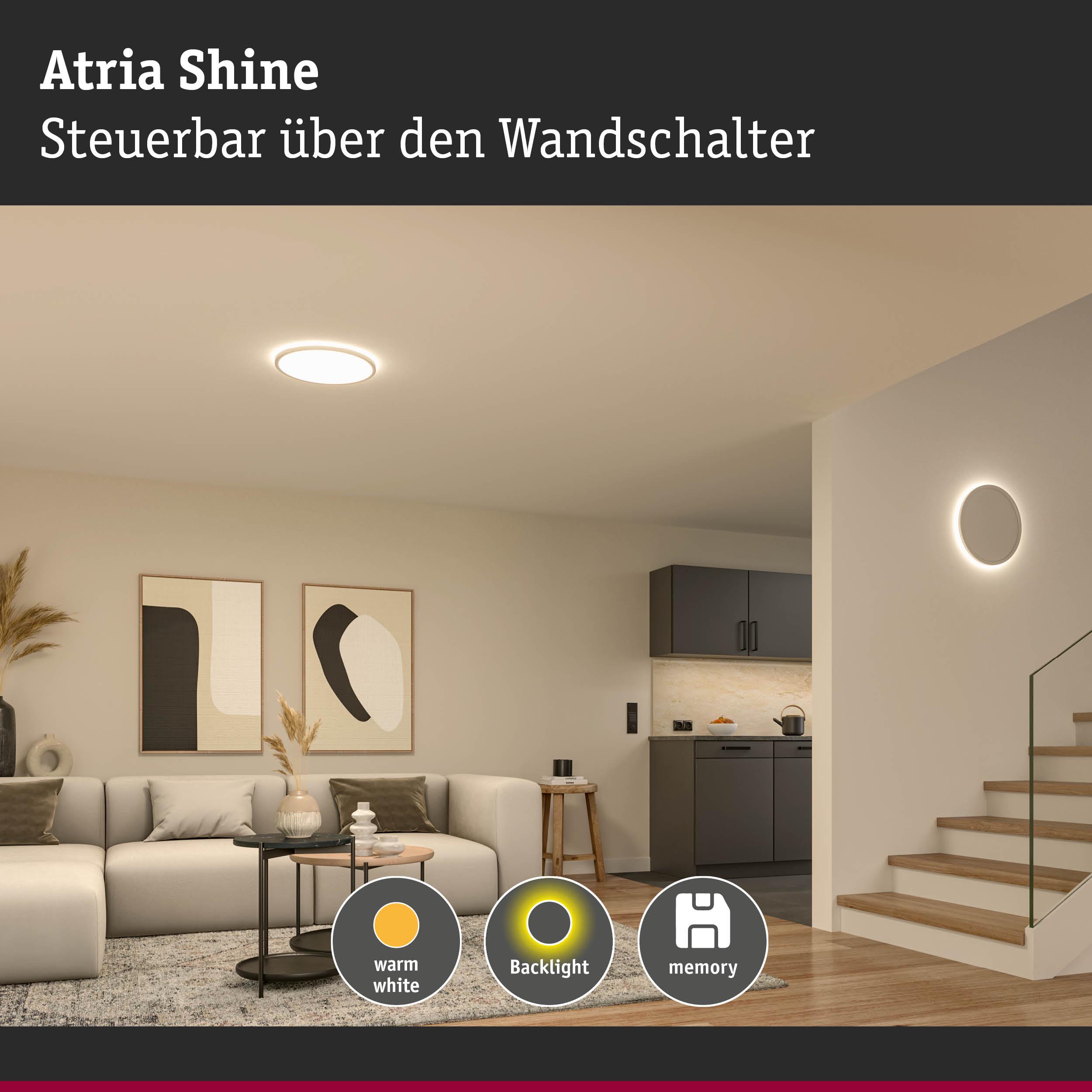Das vielseitige Panel Atria Shine mit einem Durchmesser von 400mm bietet sowohl direkte als auch indirekte Beleuchtung, durch die separat steuerbare Front- und Backlight-Technik. Diese lässt sich unkompliziert per Wandschalter durch mehrmaliges schnelles Ein- und Ausschalten steuern. Somit kann je nach Stimmung oder Anwendungsfall zwischen voller Beleuchtung, nur dem Frontlight oder nur dem atmosphärischen Backlight variiert werden. Dank der Memory-Funktion wird die gewählte Lichtszene gespeichert, sodass die Leuchte beim nächsten Einschalten in der zuvor eingestellten Lichtintensität leuchtet. Das Panel sorgt für eine gleichmäßige Ausleuchtung in Innenräumen und erzeugt durch die warmweiße Lichtfarbe von 3000K eine wohnliche Atmosphäre. Das schlichte Design des Panels besticht durch seine besonders flache Bauweise und die stimmungsvolle Backlight-Technologie verleiht dem Panel eine dezente, und fast schwebende Optik. Die Montage an Wand oder Decke gestaltet sich dank der Schnellklemme und des Drehverschlusses besonders einfach und unkompliziert