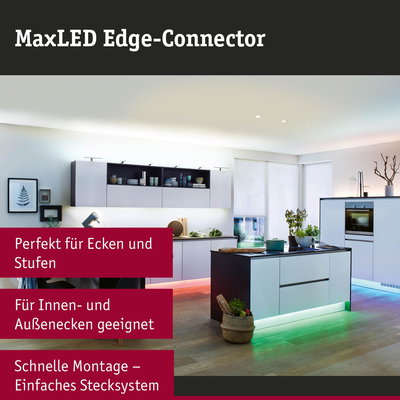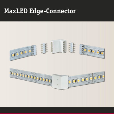 Das MaxLED-System lässt sich mithilfe von Verbindern perfekt an räumliche Besonderheiten wie Ecken oder Stufen anpassen oder verzweigen. Der Eckverbinder ermöglicht die Verlegung der Strips in Innen- sowie um Außenecken.