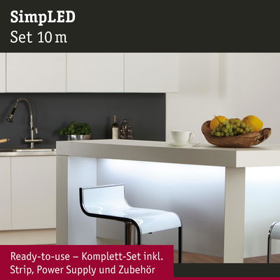 Den SimpLED-Strip auf die gewünschte Länge zuschneiden, aufkleben und in die Steckdose stecken: so einfach können stimmungsvolle Lichtakzente an Möbeln oder in Profilen gesetzt werden. Das flexible Material passt sich an verschiedenste Untergründe an. Schutz vor Staub und Spritzwasser bietet die Beschichtung, sodass der Einsatz an Spüle und Waschbecken problemlos möglich ist.