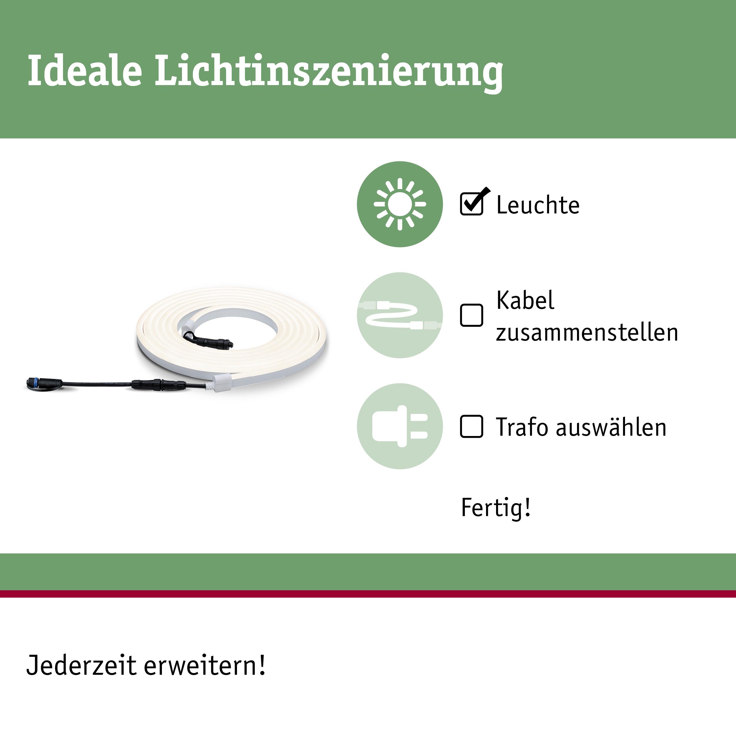 Der Plug & Shine Neon LED Strip ist absolut wetterbeständig und lässt sich direkt an das Ende des 24V-Systems anschließen. Er spendet homogenes Licht, so entsteht eine flexibel zu verlegende Lichtlinie, ohne sichtbare LED Punkte. Daher eignet er sich ganz besonders zur direkten Beleuchtung am Wegrand, im Beet oder an Kanten. Der LED Strip kann nur ein einziges Mal mit demselben Strip erweitert werden. Es können keine Kabel oder Leuchten angeschlossen werden. Zur optimalen Befestigung empfehlen wir die entsprechenden Montageclips oder das Aluminiumprofil.