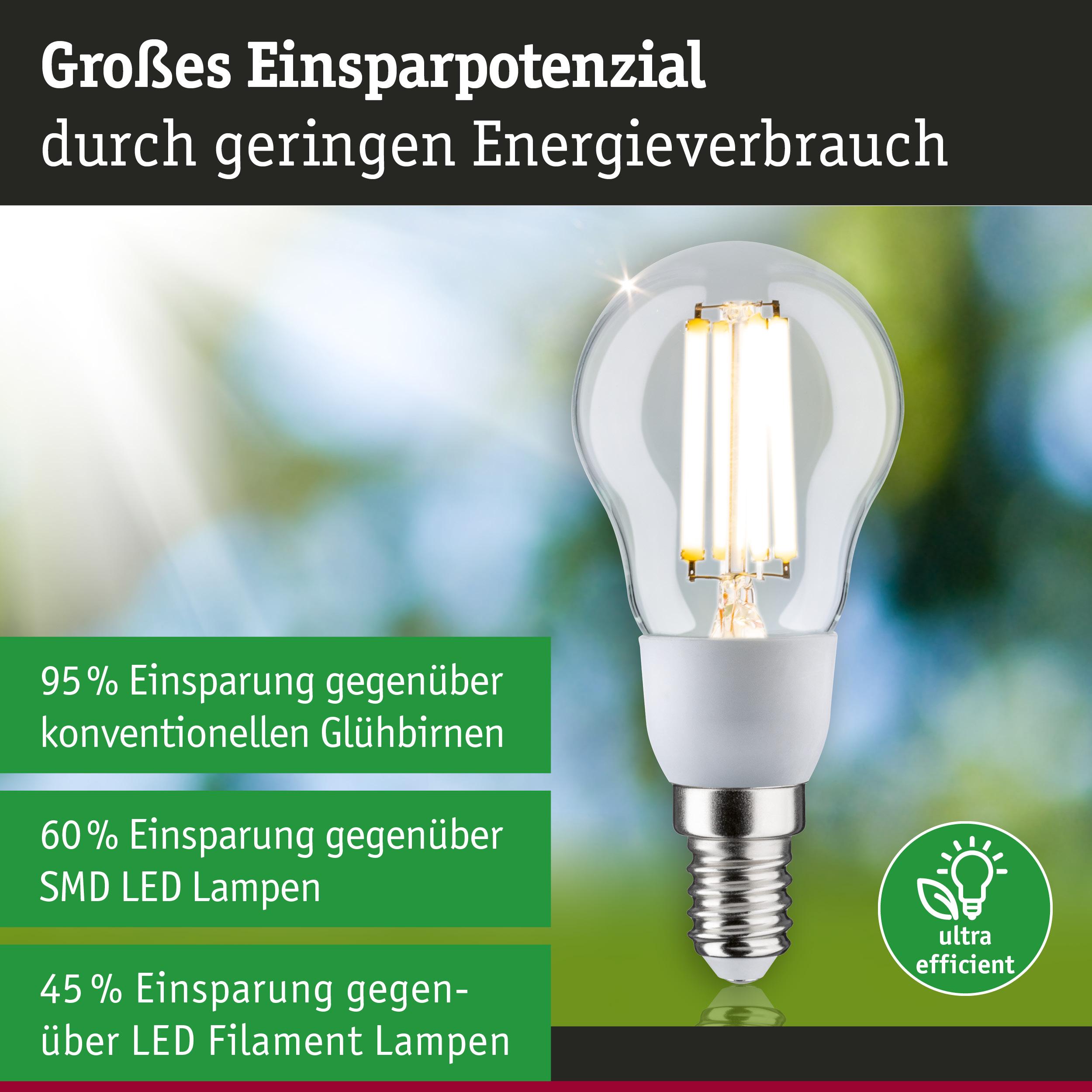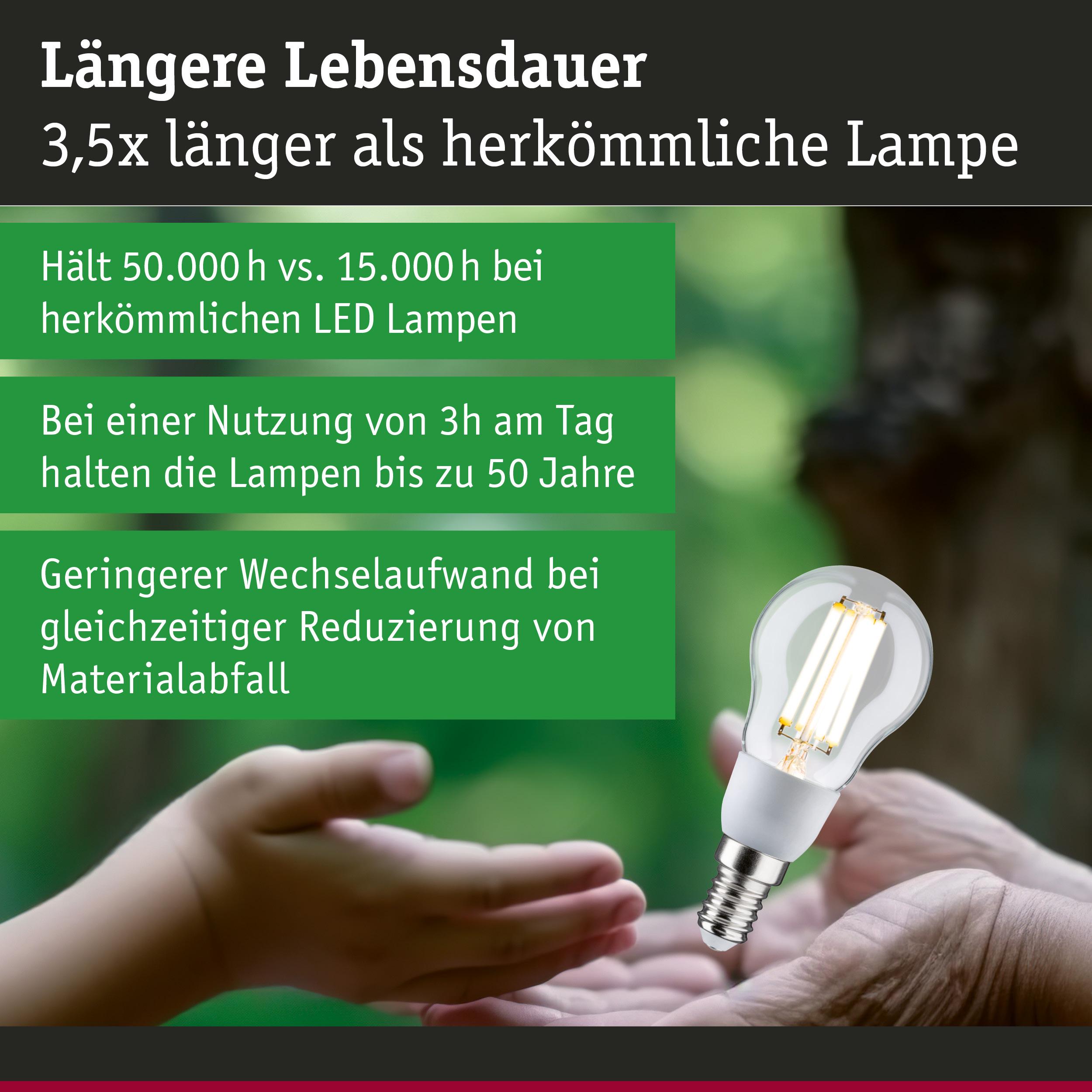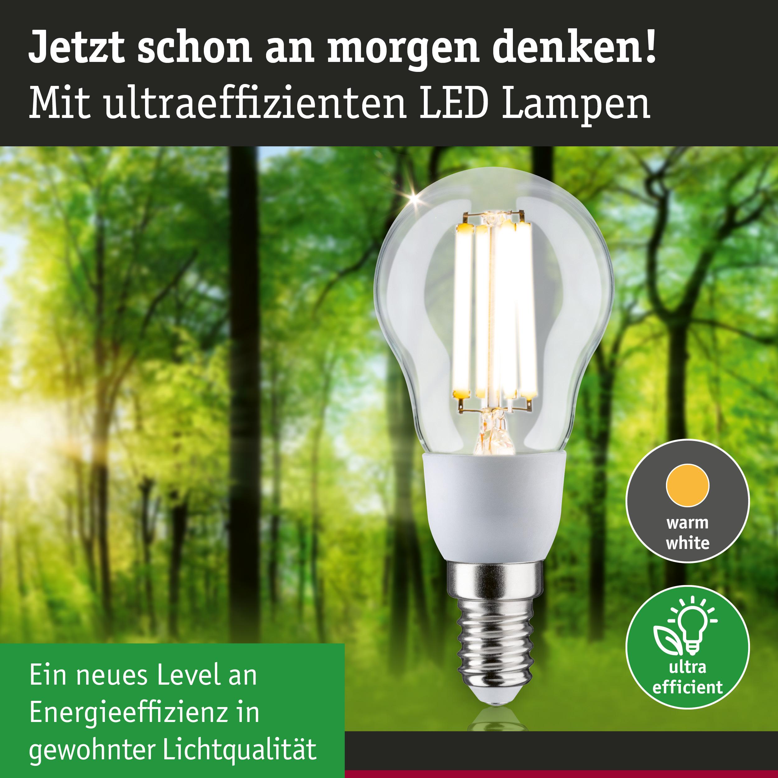 Die ultra-effizienten Leuchtmittel der Eco-Line verbinden Innovation mit Nachhaltigkeit. Durch den 60 % niedrigeren Energieverbrauch und der deutlich längeren Lebensdauer gegenüber Standard LED-Lampen lassen sich die Energiekosten deutlich senken und ganz nebenbei noch die Umwelt schonen. Die klare Filament Tropfenlampe mit 3000K, einer Leistung von 2,5W und 525lm schafft ein angenehm gleichmäßiges Licht ohne Grünstich. Die Lampe passt in jede handelsübliche E14 Fassung. Tropfenlampen eignen sich durch ihre kompakte Bauform ideal für den Einsatz in kleinen Leuchten. Die Paulmann LED-Lampen mit Eye friendly-Siegel bieten augenschonendes und komfortables Licht. Ob beim Arbeiten, Lesen oder Entspannen, die Lampen tragen zu besten Sehkomfort bei.