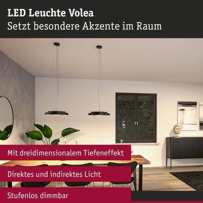 Die Volea Wand- und Deckenleuchte in Schwarz/Gold/Silber mit einem Durchmesser von 320mm ist zusammen mit der farblich passenden Pendelabhängung als praktisches Vorteilsset erhältlich. Mit der einzigartigen Kombination aus direkter und indirekter Beleuchtung verstärkt durch den dreidimensionalen Tiefeneffekt im inneren Kreis der Leuchte, wird jeder Raum in ein gemütliches und atmosphärisches Ambiente verwandelt. Das warmweiße Licht mit einer Farbtemperatur von 3000 Kelvin sorgt für eine angenehme Wohlfühlatmosphäre, egal ob im Wohnzimmer, Schlafzimmer oder sogar im Badezimmer dank des IP 44 Schutzes. Sie ist stufenlos dimmbar, sodass die Helligkeit angepasst werden kann. Im Lieferumfang ist bereits die passende Pendelabhängung enthalten, sodass die Deckenleuchte Volea bis zu 150cm von der Decke abgehängt werden. Dadurch kann das Licht gezielt über dem Esstisch oder Küchentresen platziert werden und zusätzliche Flexibilität schaffen. Die Installation gestaltet sich durch großen Anschlussraum, einfache Steckverbindungen und Drehverschluss einfach und unkompliziert.