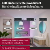 16 Millionen Farben, 16 Millionen Lichtstimmungen - Das smarte Einbauleuchten Set Nova Coin in Weiß matt mit Farbwechselfunktion schafft in jedem Raum ein individuelles Wohnambiente. Im Lieferumfang sind drei austauschbare LED-Leuchtmittel inklusive hochwertigen Alu- Einbauringen enthalten. Durch den besonders hohen IP-Schutz von IP44 eignen sich die Leuchten ideal auch für Feuchträume und sind vor Spritzwasser geschützt. Mit einer Leistung von 3x6 Watt und Zigbee 3.0-Steuerung sorgen sie für eine effiziente und innovative Beleuchtungslösung. Zigbee 3.0 ist ein Funkübertragungsprotokoll, das Geräte verschiedener Hersteller miteinander vernetzt. So lassen sich die Leuchten per App, Fernbedienung oder Sprachbefehl einzeln oder gemeinsam steuern: Ob gemütliches warmes Goldlicht (2200K), sachlich helles Tageslichtweiß (6500K) oder bunte Farbverläufe - die Kombination aus Tunable White, RGB und Dimmfunktion bietet unzählige Möglichkeiten. Einfach und bequem ist die smarte Einbauleuchte weiterhin über einen handelsüblichen Lichtschalter ein- und ausschaltbar. Der integrierte Memory-Effekt merkt sich dabei immer die zuletzt genutzte Lichteinstellung - für maximalen Komfort. Durch die Schwenkbarkeit der Leuchte lässt sich das Licht überall dort hinlenken, wo es benötigt wird. Die Montage gestaltet sich dank des verkettbaren und austauschbaren Coins, der geringen Einbautiefe von nur 45 mm und dem 230-V-Direktanschluss besonders einfach und effizient.