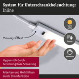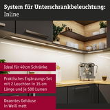 Das Erweiterungsset bestehend aus zwei Möbelleuchten Inline in dezentem Weiß matt und einer Länge von 350x26mm ist die perfekte Ergänzung für das Starterset Inline. Die Leuchten sind eine elegante Lösung, um Küchenarbeitsflächen optimal zu beleuchten. Mit der Dimmfunktion kann die warmweiße Lichtfarbe ganz nach Bedarf eingestellt werden. Zudem bestehen die Leuchten aus leicht zu reinigenden hochwertigen Materialien, sodass sie problemlos sauber gehalten werden können. Der PIR-Sensor ermöglicht ein berührungsloses Ein- und Ausschalten, was zusätzlich zur hygienischen Arbeitsweise beiträgt. Der Memory-Effekt speichert zudem die eingestellte Lichtfarbe, sodass diese nicht jedes Mal neu eingestellt werden muss. Mit einer Farbtemperatur von 3000K strahlen die Leuchten ein angenehm warmweißes Licht aus und sind dimmbar.