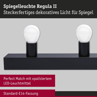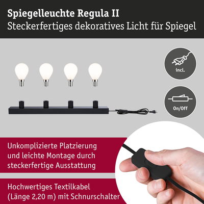 Strahlend schön – die ideale Beleuchtungslösung fürs Badezimmer. Dieses praktische Set enthält die Regula II Lichtleiste in Schwarz/Opal inklusive passenden opalen LED-Leuchtmitteln. Die 4-flammige Spiegelleuchte wird mit einem praktischen Textil-Kabelschalter geliefert, sodass die Montage zum Kinderspiel wird. Dabei wird nur eine Steckdose benötigt, ein Stromauslass an der Wand ist nicht weiter erforderlich. Mit ihrem modernen und cleanen Design fügt sie sich harmonisch in verschiedene Einrichtungsstile ein und ist optisch sowohl am Schminktisch als auch im Flur ein echter Hingucker. Die Länge von 60 cm ist an Standard-Spiegelmaße angelehnt. Im Lieferumfang sind 4 tropfenförmige LED-Leuchtmittel in Schwarz/Opal enthalten, die einen modern-klassischen Look der Spiegelleuchte erzeugen. Mit einer Leistung von je 4x4,5W geben sie ein rundum warmweißes, strahlendes Licht ab. Dabei lässt sich die Helligkeit nach individuellem Bedarf dimmen. Die Installation der Regula II gestaltet sich denkbar einfach: Sie kann über oder neben dem Spiegel an der Wand montiert werden. Nach dem Eindrehen der opalen LED-Leuchtmittel oder anderen gewünschten Leuchtmitteln mit E14 Fassung ist sie sofort betriebsbereit. Einer angenehmen Lichtatmosphäre im Badezimmer steht so nichts mehr im Weg. Zur Reinigung der Leuchten eignet sich am besten ein weiches Tuch – auf die Verwendung eines Mikrofasertuches sollte verzichtet werden.
