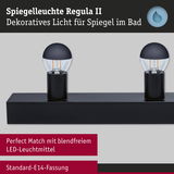 Strahlend schön – die ideale Beleuchtungslösung fürs Badezimmer. Dieses praktische Set enthält die Regula II Lichtleiste in Schwarz/Kopfspiegel Schwarz matt inklusive passender Kopfspiegelleuchten. Durch ihren besonders hohen IP-Schutz von IP44 ist die 4- flammige Regula II Lichtleiste vor Spritzwasser geschützt und eignet sich daher ideal für den Einsatz im Badezimmer oder anderen Feuchträumen. Mit ihrem modernen und cleanen Design ist sie universell in verschiedenen Einrichtungsstilen einsetzbar. Die Länge von 45 cm ist an Standard-Spiegelmaße angepasst und eignet sich auch besonders gut für kleinere Spiegel, die häufig in Gäste-WCs zu finden sind. Im Lieferumfang sind 4 Kopfspiegel Tropfenlampen in Schwarz/Kopfspiegel Schwarz matt enthalten, die für einen glamourösen Hollywood-Schminkspiegel-Look sorgen! Mit einer Leistung von je 4x4,5W geben sie ihr warmweißes Licht in alle Richtungen ab. Dabei lässt sich die Helligkeit nach individuellem Bedarf dimmen. Die Installation der Regula II gestaltet sich denkbar einfach: Sie kann über oder neben dem Spiegel an der Wand montiert werden. Nach dem Eindrehen der Kopfspiegel Tropfenlampen oder anderen gewünschten Leuchtmitteln mit E14 Fassung ist sie sofort betriebsbereit. Einer angenehmen Lichtatmosphäre im Badezimmer steht so nichts mehr im Weg. Zur Reinigung der Leuchten eignet sich am besten ein weiches Tuch – auf die Verwendung eines Mikrofasertuches sollte verzichtet werden.