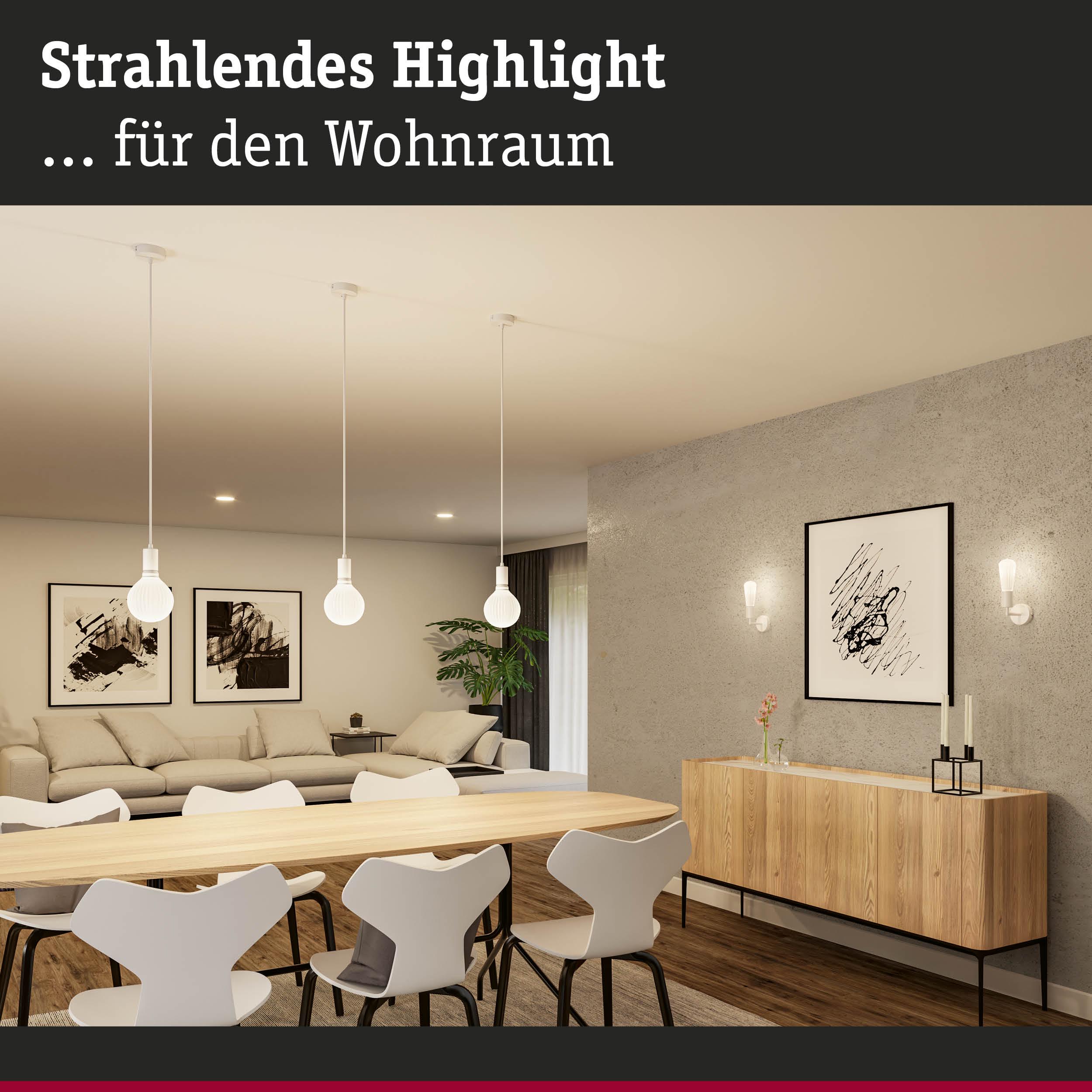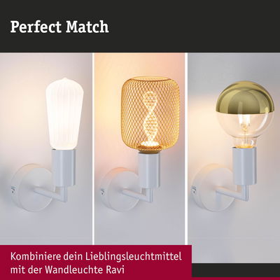 Der Mix & Match Look ist absolut im Trend und ermöglicht das Zuhause mit einem besonderen Blickfang zu verschönern. Die moderne Wandleuchte Ravi in Weiß matt ist ein perfekter Beweis dafür. Mit ihrem minimalistischen, modernen Design und der attraktiven Farbkombination wird sie zu einem echten Highlight im Zuhause. Kombiniert mit den dekorativen Leuchtmitteln von Paulmann entsteht ein perfektes Set. Besonders harmonisch sieht die Leuchte in Kombination mit Leuchtmitteln aus den Serien White Lampion oder Metallic Glow aus. Alternativ lassen sich Leuchtmittel mit E27-Sockel bis max. 60 Watt verwenden. Dank des IP44-Schutzes kann die Wandleuchte Ravi selbst im Bad verwendet werden.