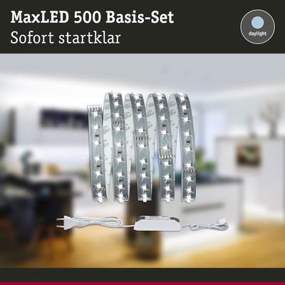 MaxLED-Strips 500 sind mit 9W und 550lm/m so leistungsstark, dass sie problemlos zur Raumausleuchtung eingesetzt werden können. Besonders in Profilen sind sie echte Highlights. Tageslichtweiße Strips sorgen für aktivierendes und konzentrationsförderndes Raum- und Nutzlicht. Das Basisset enthält neben dem Streifen mit einer Länge von 1,5m ein passendes Vorschaltgerät. Es lässt sich nach Bedarf mit zusätzlichen Strips, Verbindern und Steuerungseinheiten mit Fernbedienung erweitern. Bei der Planung darf die Maximallänge nicht überschritten werden, welche auf dem Basisset angegeben ist.