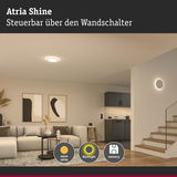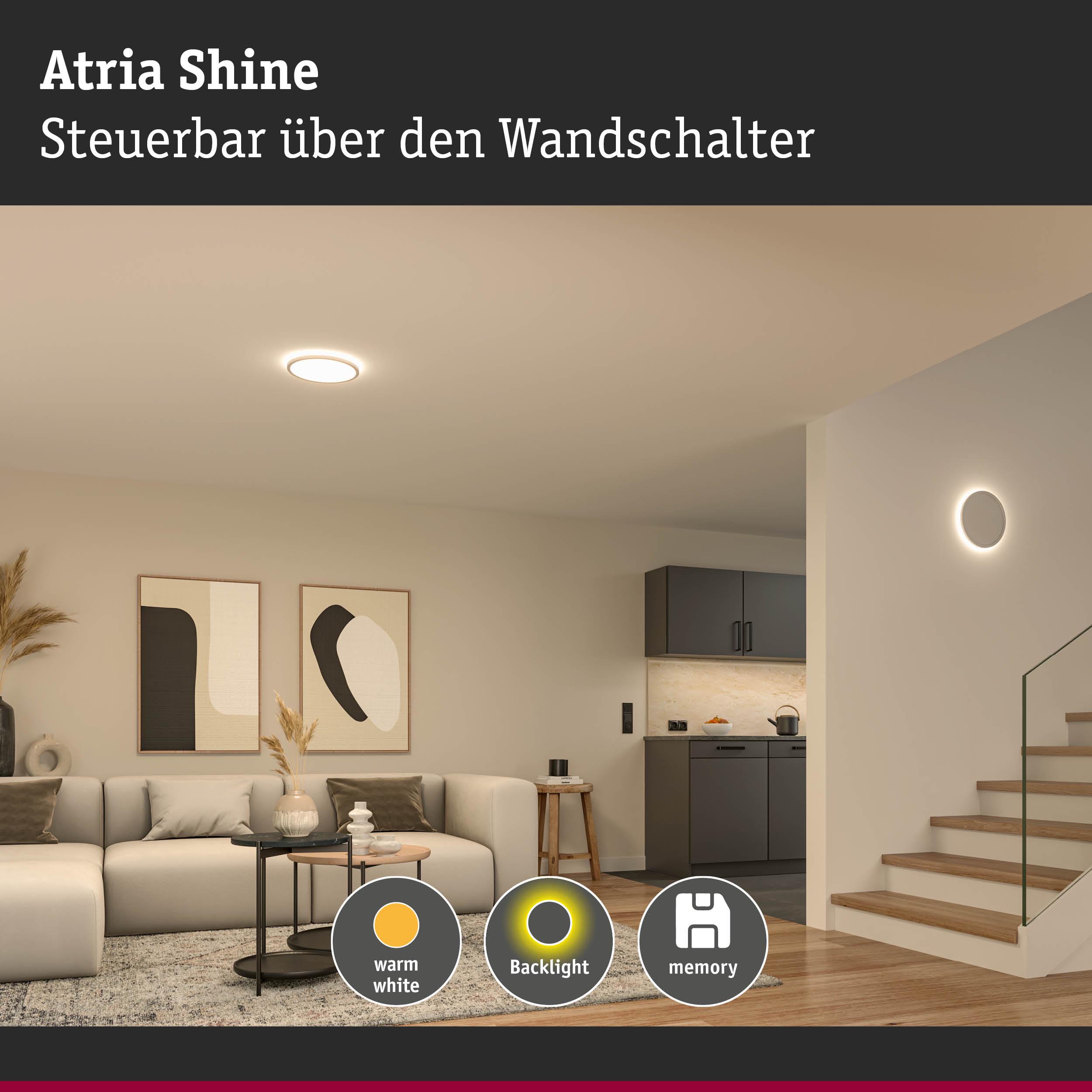 Das vielseitige Panel Atria Shine mit einem Durchmesser von 290mm bietet sowohl direkte als auch indirekte Beleuchtung, durch die separat steuerbare Front- und Backlight-Technik. Diese lässt sich unkompliziert per Wandschalter durch mehrmaliges schnelles Ein- und Ausschalten steuern. Somit kann je nach Stimmung oder Anwendungsfall zwischen voller Beleuchtung, nur dem Frontlight oder nur dem atmosphärischen Backlight variiert werden. Dank der Memory-Funktion wird die gewählte Lichtszene gespeichert, sodass die Leuchte beim nächsten Einschalten in der zuvor eingestellten Lichtintensität leuchtet. Das Panel sorgt für eine gleichmäßige Ausleuchtung in Innenräumen und erzeugt durch die warmweiße Lichtfarbe von 3000K eine wohnliche Atmosphäre. Das schlichte Design des Panels besticht durch seine besonders flache Bauweise und die stimmungsvolle Backlight-Technologie verleiht dem Panel eine dezente, und fast schwebende Optik. Die Montage an Wand oder Decke gestaltet sich dank der Schnellklemme und des Drehverschlusses besonders einfach und unkompliziert